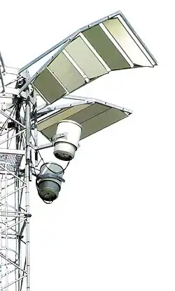 At Sundsvall-Härnösand Airport near Sundsvall, Sweden, airfield lighting is provided by sulfur lamps mounted on towers 30 metres tall. The lamps are directed upward and shine their light onto wing-shaped secondary reflectors that spread the light out and direct it downward. In this way, one lamp can illuminate an area 30 by 80 metres (100 by 260 ft).