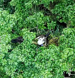 All sulids breed in colonies. Males examine the colony area in flight and then pick a nest site, which they defend by fighting and territorial displays. Males then advertise to females by a special display and call. Their display behavior is characteristic, though not as diverse as the numerous variations found among the cormorants; it typically includes the male shaking his head. Females search the colony in flight and on foot for a mate. Once they select males, pairs maintain their bonds by preening each other and by frequent copulation.[3][5]