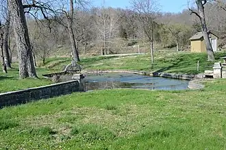 This spring was the first in the park to be discovered. There is a shelter over the spring, and limestone benches alongside it that were carved from the nearby bluff in 1889.