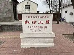 The tomb and monument to the Sulu king still stands today, covering an area of over 80 acres about 1 km north of Dezhou. It was renovated after 1980, and in 1988 it became a national priority protected site. The monument features stone men, horses, sheep, and leopards.[6] The museum inside the complex became a national second-class museum in 2024.[12]