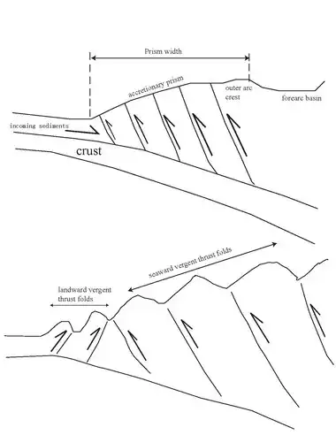 The North Sumatra region is defined here as the segment between 2.4–6°N. Accretionary wedges and forearcs here are very broad. A steep toe also presents. Average accretionary wedge has a width about 155–163 km, and the forearc basin has about 100–140 km thickness.[6] Superficial average slope is about 1.2–1.3° while the outer part (about 50 km) becomes extremely steeper (3.3–3.9°) compare to the rest. Landward vergence of thrust folds, primarily frontal fold vergence is the most ubiquitous tectonic event happens at the prism bottom. Several landward vergences have been transformed into seaward. Seaward vergence is common further into the prism while landward vergent structures are more rare. The unusual structure here results in not only a strong wedge interior, but also tendency of a duplex deformation.[1]
