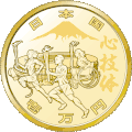 500 yen | Bi-metallic (copper-nickel plated copper center in nickel-brass ring) | Thunder God | 26.5 mm | 7.1 g | Games of the XXXII Olympiad | 4,000,000 |