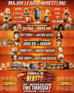 Summer of the Beasts (2024) was a professional wrestling event produced by Major League Wrestling (MLW) that took place on August 29, 2024, at the Melrose Ballroom in Queens, New York. The event streamed live on MLW's YouTube channel.[1] A "surprise" streaming special called "Summer of the Beasts: Part 2", featuring unseen dark matches from the event, and the Bobby Fish vs Timothy Thatcher match that was cut from the live broadcast due to technical issues, would be uploaded to YouTube on September 7.[2]