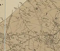 The Summerville site was originally part of a 17,653-acre tract granted by the British crown to John Tullit.[1] From 1705 to 1760, the tract was owned by numerous people with the names of Page, Digges, Cary, Price, and Lacy. In 1760, the original 200-acre parcel was bought by Robert Moseley (1732–1804) and Magdalene Guerrant Moseley (1740–1826), a young couple, from Thomas Lacy for 65 pounds. Two additional purchases in 1762 and 1763 of 228 and 100 acres, respectively, brought the total acreage of the farm to 528 acres. The Moseley's built a small house at Summerville in the early 1760s which was soon enlarged on account of the number of children they had: Thomas, Arthur, John, Magdalene, Judith, William, and Peter.[2] The site of the Summerville house was on a ridge overlooking the Michaux Creek valley and "it is said that the westward view was unsurpassed in that area of Virginia."[3] In 1777, Summerville was sold to Colonel William Fleming of "Mount Pleasant" in neighboring Powhatan County, while Robert, Magdalene, and their family moved to a much larger plantation in Buckingham County called "Willow Lake."[4]