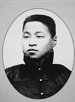 At the age of 17, Sun Yuqi was admitted to Shaoxing Jianyi Normal School (Chinese: 绍兴简易师范学校) and graduated at the end of 1911. In accordance with the official policy at the time, he taught in a primary school for a year on voluntary duty.[6] During this time, he married Ge Caixiang (Chinese: 葛采湘) under an arranged marriage deal made in their childhoods by their parents.[7] In 1913, Sun enrolled in the Middle School Department of Fudan Public School in Shanghai, where he got to know political activists like Shao Lizi, Luo Jialun and Yu Dawei. In May 1915, angered by Yuan Shikai's acceptance of the Twenty-One Demands proposed by the Japanese government, Sun changed his name to "Yueqi" (Chinese: 越崎; lit. 'Overcome ruggedness').[8] After graduating in 1916, Sun studied under the Liberal Arts Preparatory Department in Beiyang University. Under persuasion from his father, Sun transferred to the Mining and Metallurgy Department later the same year.[9]