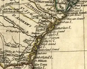 The area that would become the town of Sunbury was first settled by Europeans in 1752 by the families of Benjamin and Samuel Baker, from the British Province of South Carolina.[1] The site was on the south bank of the Midway River,[note 1] in what was at the time the Province of Georgia,[1] on a bluff several miles upriver from St. Catherine's Sound.[2] In 1757, 500 acres (200 ha) of this area was conveyed by King George II of Great Britain to Mark Carr, a wealthy military officer.[3] Carr sold some land lots to other people, and soon several wharves on the river and a trading post were established.[3]