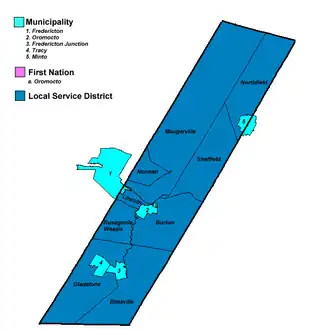 | Burton | 259.10 | 5,119 | Oromocto (town) Oromocto 26 (reservation) |