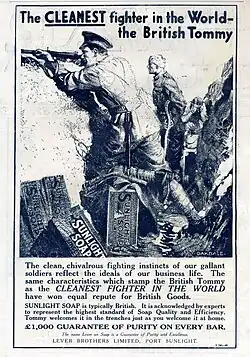 Sunlight household soap was introduced by the British company Lever Brothers in 1884. It was the world's first packaged, branded laundry soap.[3] Designed for washing clothes and general household use, the success of the product led to the name of the company's village for its workers, Port Sunlight. The soap formula was invented by a Bolton chemist named William Hough Watson, who also became an early business partner. Watson's process created a new soap, using glycerin and vegetable oils, such as palm oil, rather than tallow (animal fats).[4] William Lever and his brother James Darcy Lever invested in Watson's soap invention, and its initial success came from offering bars of cut, wrapped, and branded soap in his father's grocery shop. This was an early labour-saving device for the housewife as commercially made soap was bought in long bars before this. Sunlight soap was eventually supplanted by modern products made from synthetically produced detergents rather than naturally derived soaps.