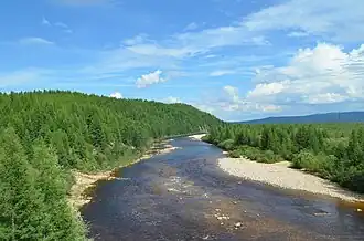 The Sunnagyn is the highest subrange of the Aldan Highlands of the South Siberian System. It rises at the northeastern edge of the highlands, south of the right bank of the Aldan River, between the valley of its tributary Timpton to the west, and the Uchur to the east. The Gynym, a tributary of the Uchur, marks the southern border of the range.[1][2][3]