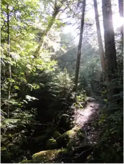 The crest of Sunrise Mountain is one of the most frequently visited sites in Stokes State Forest. The thin soil and harsh climate characteristic of Sunrise Mountain is a difficult environment in which few plants can survive. Mountain laurel, blueberry, pitch pine and bear oak are among the natural vegetation found throughout the area. The pavilion at the summit was built in the late 1930s by the Civilian Conservation Corps.[2]