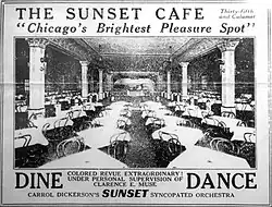 The Sunset Cafe, also known as The Grand Terrace Cafe or simply Grand Terrace,[1] was a jazz club in Chicago, Illinois operating during the 1920s, 1930s and 1940s. It was one of the most important jazz clubs in America, especially during the period between 1917 and 1928 when Chicago became a creative capital of jazz innovation and again during the emergence of bebop in the early 1940s. From its inception, the club was a rarity as a haven from segregation, since the Sunset Cafe was an integrated or Black and Tan club where African Americans, along with other ethnicities, could mingle freely with white Americans without much fear of reprisal. Many important musicians developed their careers at the Sunset/Grand Terrace Cafe.