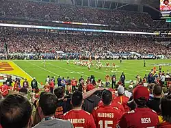 The first half of the game was back and forth between both teams, with the game tied at 10 at halftime. In the third quarter, the 49ers began to pull away, with a Robbie Gould field goal and a touchdown run by Raheem Mostert giving them a 20–10 lead heading into the fourth quarter. However, over the final 6:13 of the game, the Chiefs offense completed two touchdown drives with Mahomes throwing touchdown passes to Travis Kelce and Damien Williams, to take the lead just before the two-minute warning. The Chiefs then stopped the 49ers on defense, and a late touchdown run by Damien Williams, as well as a Kendall Fuller interception, sealed the victory and ended the Chiefs' 50-year championship drought as well as earning Andy Reid his first NFL championship as a head coach.[2] Mahomes was named Super Bowl MVP, having completed 26 of 42 pass attempts for 286 yards, two touchdowns and two interceptions, as well as rushing for 29 yards and one touchdown.[3]