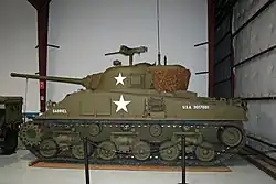 This project started in 1954 and in 1955, a prototype turret was sent from France to Israel.[4] In March 1956, Israeli Ordnance Corps military facilities began to convert (up-gun) their Sherman tanks with 75mm tank guns of AMX-13s bought and received from France.[5] The 75mm tank gun was known in Israel as the M-50 and, as a result, the up-gunned Sherman was designated as the Sherman M-50.[4] The M-50 was similar to the WWII-era British Sherman Firefly tank in that it possessed the original smaller type of Sherman tank turret (as used by US Shermans which carry the original 75mm M3 tank gun) which was fitted with a large counterweight at the turret's rear end to balance the weight of a longer and heavier tank gun.