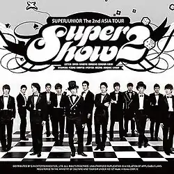 Super Show 2 is the second Asia-wide live concert tour by the South Korean boy band Super Junior, to support their third studio album, Sorry, Sorry.[1] The tour commenced with three shows in Seoul, South Korea in July 2009 and continued with one show in Hong Kong, five in China, two in Thailand, two in Taiwan, one in Malaysia and one in Philippines. A total of 15 shows in nine cities and six countries throughout Asia.[2]