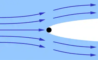 A key feature of the supercavitating object is the nose, which typically has a sharp edge around its perimeter to form the cavitation bubble.[1] The nose may be articulated and shaped as a flat disk or cone. The shape of the supercavitating object is generally slender so the cavitation bubble encompasses the object. If the bubble is not long enough to encompass the object, especially at slower speeds, the bubble can be enlarged and extended by injecting high-pressure gas near the object's nose.[1]