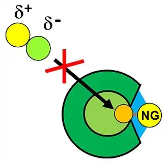 After the noble gas has been bound to the boron atom, its substitution by a nucleophile in a typical SN2 reaction is prevented by the cage structure of the borate, since the noble gas-boron bond is shielded sterically (cf. Fig. 6).[1]