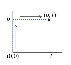 Here is the molar entropy and the molar volume. With Eq.(2) can be found by a line integration in the – plane. First, we integrate from the origin to , so at . Next, we integrate from to , so with constant pressure (see figure 6). In the first integral and in the second . With Eq.(2) we obtain