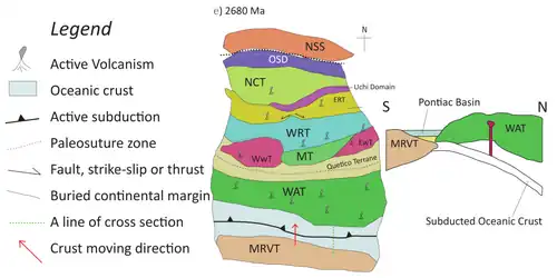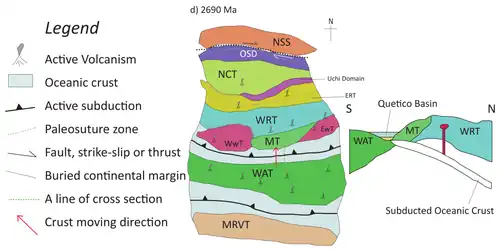 The northward direction of the subduction is evident due to the ceased arc magmatism in Winnipeg River superterrane at about 2695 Ma. Apart from the ceased magmatism, the sanukitoid plutons formed in the area during 2695-2685 Ma (which inferred the breakoff of a subduction slab) also indicated the subduction towards the north. After the subduction, the two terranes were sutured under the Quetico belt. This also trapped the clastic sediments fluxing into the belt, marking its transition from an accretionary wedge to a foreland basin.[71] At the northern Wawa-Abitibi terrane, researchers identified two events of deformation occurred during the orogeny. The first one (D1 deformation event) is the intra-arc deformation accompanied by calc-alkaline magmatism during 2695 Ma. The second one (D2 deformation event) is the transpressive deformation at the margin between the Wawa-Abitibi Terrane and the Wabigoon terranes during 2685-2680 Ma.[71]