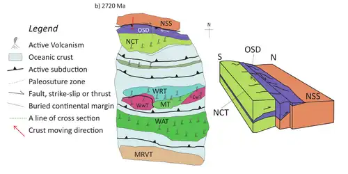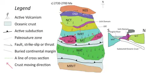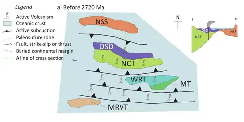 Before 2720 Ma, there were many pieces of microcontinent fragments which E-W trending conduit-like ocean crusts (with unknown extent) separates them.[70] During 2720 Ma, active subduction along the Northern Superior Superterrane and the North Caribou Terrane caused the southward drifting of the Northern Superior Superterrane. Over time, it united the North Caribou Superterrane and confined the Oxford-Stull domain, which contains rock assemblages related to the continental margin and oceanic crust.[70][71] The combination of the Northern Superior Superterrane and the North Caribou Superterrane by subduction marked the initiation of the Superior Craton formation. The southward movement of the Northern Superior Superterrane to the North Caribou Superterrane driven by subduction activity is evident by a) arc-related magmatism in Oxford-Stull domain during 2775-2733 Ma;[71] b) the south-over-north shearing zone at the contact between the two terranes.[72] The suture zone of the subduction is inferred to be the margin of the North Kenyon Fault.[71] The docking of the Northern Superior Superterrane is evident by the >3.5 Ga detrital zircons found in synorogenic (meaning that it forms during an orogenic event) sedimentary rocks aged <2.711 Ga.[71] The docking also initiated the eruption of shoshonitic volcanic rocks during 2710 Ma and the regional shortening. The regional shortening had undergone folding and foliation to form right-lateral, NW-trending shear zones.[70][71]
