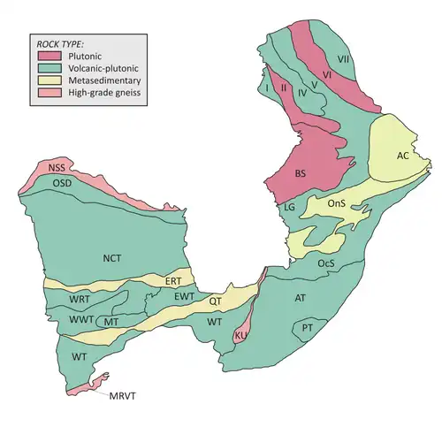 - II: pyroxene-bearing plutonic rocks[4] - IV: metasedimentary and pyroxene-bearing pluton[66] - V: pyroxene-bearing pluton with minor tonalite[4] - VI: magnetic pyroxene-bearing pluton[67] - VII: tonalitic complex[7][6] |
