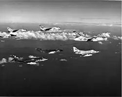 Although the Scimitar could operate as a fighter, the interceptor role was covered by the de Havilland Sea Venom and then the de Havilland Sea Vixen.[20] The Scimitar itself was replaced by the Blackburn Buccaneer.[21] It was kept initially as a tanker to allow the underpowered Buccaneer S.1 to be launched from aircraft carriers with a useful weapons load. To save weight, the Buccaneer would take off with a reduced fuel load then refuel from a Scimitar immediately after.[22] Late in the Scimitar's operational career, 16 examples were flown between 1965 and 1970 by the Fleet Requirements Unit (FRU) based at Bournemouth Airport (Hurn).[23][24] The FRU was managed by Airwork Services and provided realistic flight operations for land and sea-based naval training units.[25]
