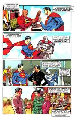 In exchange for the Supermen's silence about his involvement with the Unimaginable fiasco, Lexcorp cuts its ties with the Supermen of America charities. Lex Luthor signs all property deeds over to the organization, including Outreach 1.