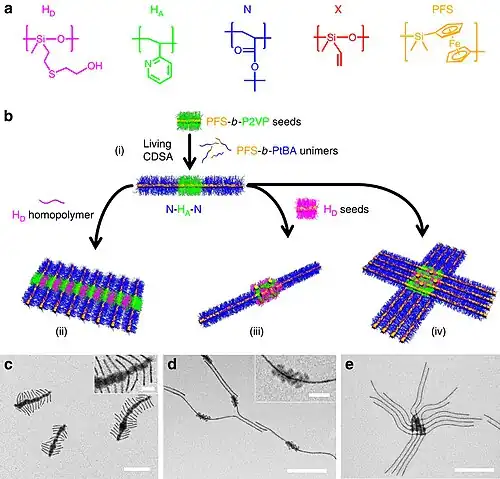 - ^ a b c Li, Xiaoyu; Gao, Yang; Boott, Charlotte E.; Winnik, Mitchell A.; Manners, Ian (2015). "Non-covalent synthesis of supermicelles with complex architectures using spatially confined hydrogen-bonding interactions". Nature Communications. 6: 8127. Bibcode:2015NatCo...6.8127L. doi:10.1038/ncomms9127. PMC 4569713. PMID 26337527.