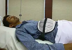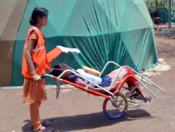 The mono-wheel ambulance is a stretcher that can be carried or pulled by a bicycle, with an integrated portable ventilator to provide respiratory support to the victim.[5][31] Its single-wheel design enables transport on rough and jungle terrain.[5] The relief measures also include a first aid kit.[5][31] The ambulance kit is to be distributed free of cost to over 300 jungle settlements by June 2014.[5][34]