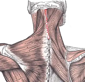 Posterior view of muscles connecting the upper extremity to the vertebral column. Nuchal ligament labeled in red at center. | |