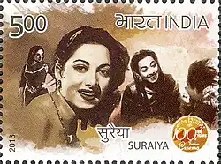 In May 2013, a postage stamp, bearing her image in various roles, was released by the India Post of the Government of India to honour her on the occasion of the 100 years of Indian Cinema.[200] Suraiya's songs, as a tribute to her, are played every year on her birth anniversary (15 June) and her death anniversary (31 January), by Radio Ceylon.[201] In 2016, Bhaichand Patel wrote about Suraiya in his book "Bollywood's Top 20: Superstars of Indian Cinema".[57] ShemarooMe gave tribute to Suraiya through the shows Naam Toh Suna Hoga and Screen Legends, in 2021 and 2022 respectively.[202][203] In 2023, an exhibition at Kiran Nadar Museum of Art in Noida, named "Sitaare Zameen Par", had portraits of Suraiya that were captured by JH Thakkar.[204] The same year, her souvenirs were auctioned online, along with that of other actresses.[205] In 2024, Ranjan Sain published Suraiya's biography, "The Immortal Queen Suraiya".[153]