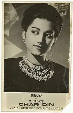 Suraiya Jamal Sheikh (15 June 1929 – 31 January 2004), mononymously known as Suraiya, was an Indian actress and playback singer who worked in Hindi films.[1] She is regarded as one of the greatest and finest actresses in the history of Indian cinema.[2] In a career spanning from 1936 to 1964, Suraiya acted in over 70 films and sang 338 songs. She was known for her strong on-screen portrayals in a variety of genres.[3] Suraiya was the most celebrated actress between the mid- to late 1940s and early 1950s and was paid more than her male counterparts.[4][5][6]
