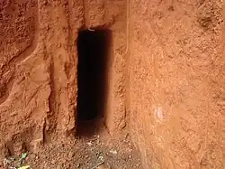 Suranga (also Surangam or thurangam) (English: Tunnel well) is a traditional water management system used to provide a reliable supply of water for human settlements and irrigation in Kasargod district of Kerala and Dakshin Kannada district of Karnataka, India.[1][2][3] A suranga is basically a horizontal tunnel dug in the slope of a laterite hill for about 30 metres (98 ft) to 40 metres (130 ft), which uses gravitational force for extraction of the underground water and collect into a storage tank.[2] As both the areas are covered by uneven and steep laterite hill which makes boring of traditional bore well hard and expensive, surangas are considered as a relatively cheap option.[1]: 659