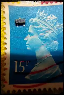 A MOSFET, placed upon a British postage stamp for size comparison.