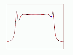 Even at the smallest scales of current semiconductor technology, each operation is carried out by huge streams of electrons.[24] Reducing the number of electrons involved in these processes, with the ultimate goal of achieving single electron control is a serious challenge. This is due to the electrons being highly interactive with each other and their surroundings, making it difficult to separate just one from the rest.[25] The use of SAWs can help with achieving this goal. When SAWs are generated on a piezoelectric surface, the strain wave generates an electromagnetic potential. The potential minima can then trap single electrons, allowing them to be individually transported. Although this technique was first thought of as a way to accurately define a standard unit of current,[26] it turned out to be more useful in the field of quantum information.[27] Usually, qubits are stationary, making the transfer of information between them difficult. The single electrons, carried by the SAWs, can be used as so called flying qubits, able to transport information from one place to another. To realise this a single electron source is needed, as well as a receiver between which the electron can be transported. Quantum dots (QD) are typically used for these stationary electron confinements. This potential minimum is sometimes called a SAW QD. The process, as seen in the GIF on the right, is typically as follows. First SAWs are generated with an interdigital transducer with specific dimensions between the electrodes to get the favorable wavelengths.[24] Then from the stationary QD the electron quantum tunnels to the potential minimum, or SAW QD. The SAWs transfer some kinetic energy to the electron, driving it forward. It is then carried through a one dimensional channel on a surface of piezoelectric semiconductor material like GaAs.[25][26] Finally, the electron tunnels out of the SAW QD and into the receiver QD, after which the transfer is complete. This process can also be repeated in both directions.[28]