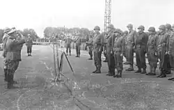 On September 17, 1944, with newsreel cameras rolling in what was described "as the best covered surrender of this, or any war," a formal surrender ceremony was conducted on the Beagency bridge over the Loire River with Generals Elster, Macon, and Otto P. Weyland of the Army Air Force presiding. No representatives of the French Resistance were invited to the ceremony. Sam Magill was belatedly invited to stand among the colonels and generals, causing some consternation that a mere lieutenant was "gate-crashing." Magill was later invited to Paris and allotted four minutes to tell the story of his platoon to the media.[18][19][20]