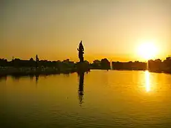 A 111 feet (34 m) tall statue of lord Shiva built by Vadodara Mahanagar Seva Sadan stands in the middle of the lake. The construction of the statue started in 1996 and it was completed in 2002. In 2023 on the festival Mahashivratri the statue of Lord Shiva was gilded. The gilding utilized about 17.5 kg (39 lb) of gold. The gold plated statue of Lord Shiva has now been officially dedicated to the city and its people. The value of gold itself is about 12 Crore Indian Rupees ($1,449,879.60 as of February 2023)[1][2] The statue of Shiva is lit with lights on Mahashivratri.