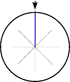 The surveyor's wheel is marked in fractional increments of revolution from a reference position. Thus its current position can be represented as a fraction of a revolution from this reference. If the wheel rotated a full turn (360 angular degrees), the distance traveled would be equal to the circumference of the wheel. Otherwise, the distance the wheel traveled is the circumference of the wheel multiplied by the fraction of a full turn. In the figure on the right, the blue line is the reference starting point. As the wheel turns during measurement, it is seen that the wheel sweeps out an angle of 3π/4 radians, which is equal to 135 degrees or 3/8 of a full turn.