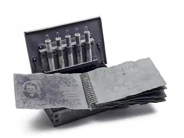 Among the latter works, Giving Fear a Proper Name: Detroit (1980–85) has been described as a poetic, fragmented representation of inner-city fear and alienation; bound in pink Cadillac car vinyl, its pages include collaged objects (bloody teeth, straight pins, slashed and pierced photographs) and text about various phobias.[39][40] Radio-Active Substances (1994–7) is a memorial to the life of Marie Curie and examination of feminist issues, created for the Smithsonian exhibition "Science and the Artist's Book." Along with quotes and illustrations by Curie, it features a cover and pages made of lead sheeting and a box whose lid holds test tubes containing printed scrolls—materials that suggest themes of danger, illness, exploration and destruction.[41][14] Washington Post critic William F. Powers called it an "eerie and provocative" work reminding viewers that "scientific knowledge is an exquisite and dangerous thing."[32]