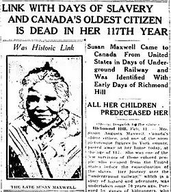 - ^ Wang, Sheila (20 February 2019). "Black History Month: The long life of Susannah Maxwell". Richmond Hill Liberal. Retrieved 29 November 2021 – via toronto.com.