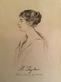 In 1777 she married John Taylor (1750–1826) who was a wool merchant and hymn writer. Susannah was a Bluestocking with strong political (Whig) beliefs.[4][5] Susannah and John's home was the place for gatherings which discussed radical politics. Guests included Sir James Edward Smith, the botanist, Henry Crabb Robinson, the barrister, Robert Southey, poet laureate, Cecilia Windham, wife of William Windham and Sir James Mackintosh. Thomas Coke, 1st Earl of Leicester and William Keppel, 4th Earl of Albemarle, both Whigs, are recorded as being entertained by Susannah in her drawing room after completing their routine farming business at the marketplace in Norwich.[6][7] Mackintosh described the house as a "haven" with Susannah described as intelligent and knowledgeable.[8] It was here that she met her friend and fellow Bluestocking, Anna Laetitia Barbauld, a close friend of Sarah Martineau who was the aunt of Susannah's husband, John.[9][10] The Taylor and the Martineau families were important political allies.[11]