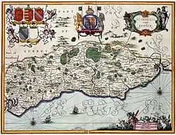 The flag of Sussex consists of six gold martlets, or heraldic swallows, on a blue background, blazoned as Azure, six martlets or. Recognised by the Flag Institute on 20 May 2011, its design is based on the heraldic shield of Sussex. The first-known recording of this emblem being used to represent the county was in 1611 when cartographer John Speed deployed it to represent the Kingdom of the South Saxons. However, it seems that Speed was repeating an earlier association between the emblem and the county, rather than being the inventor of the association. It is now firmly regarded that the county emblem originated and derived from the coat of arms of the 14th-century Knight of the Shire, Sir John de Radynden.[4] Sussex's six martlets are today held to symbolise the traditional six sub-divisions of the county known as rapes.[5]