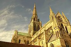 It was also during the Norman period that Sussex achieved its greatest importance in comparison with other English counties.[39] Sussex was on the main route between England and Normandy, and the lands of the Anglo-Norman nobility in what is now western France. The growth in Sussex's population, the importance of its ports and the increased colonisation of the Weald were all part of changes as significant to Sussex as those brought by the neolithic period, by the Romans and the Saxons.[39] Sussex also experienced the most radical and thorough reorganisation of land in England. The county's existing sub-divisions, known as rapes, were made into castleries and each territory was given to one of William's most trusted barons. Castles were built to defend the territories including at Arundel, Bramber, Lewes, Pevensey and Hastings. Sussex's bishop, Æthelric II, was deposed and imprisoned and replaced with William the Conqueror's personal chaplain, Stigand.[40] The Normans also built Chichester Cathedral and moved the seat of Sussex's bishopric from Selsey to Chichester. The Normans also founded new towns in Sussex, including New Shoreham (the centre of modern Shoreham-by-Sea), Battle, Arundel, Uckfield and Winchelsea.[37]