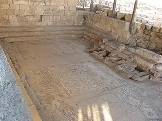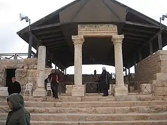 A mosque was built in the courtyard of the former synagogue. It featured a mihrab in the southern wall, a second mihrab between two columns in the southern portico, and "crude" stone benches along the walls.[9] Magness, assessing the evidence uncovered by the several archaeologists who dug at the site, which includes an inscription, dates the mosque to the reign of Caliph Al-Walid I, in the early eighth century.[9]