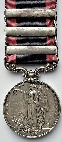 The Sutlej Medal was a campaign medal approved in 1846, for issue to officers and men of the British Army and Honourable East India Company who served in the Sutlej campaign of 1845–46 (also known as the First Anglo-Sikh War). This medal was the first to use clasps to denote soldiers who fought in the major battles of the campaign.[1]