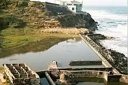 - Sutro's Aquarium (opened 1887), a concrete basin located in a cove just north of the Cliff House, fed fresh seawater by a 8 feet (2.4 m) high and 153 feet (47 m) long tunnel cut through an adjacent cliff. A heated, glass- enclosed pool was sited on higher ground above the tidal basin and featured a stocked supply of more exotic sea creatures.[2]