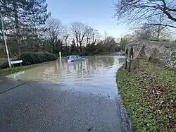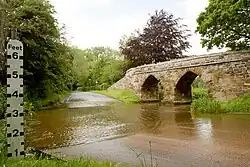 The Packhorse bridge alongside the ford is a 13th-century[16] double arched pedestrian bridge over Potton Brook, a tributary of the River Ivel.