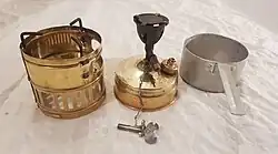 To light the stove, the fuel tank must first be pre-heated and pressurized by lighting a small amount of fuel poured into the primer pan or spirit cup (a small well) on top of the tank at the base of the vaporizer (the vertical stem connecting the fuel tank to the burner). Alternatively, the primer pan can be filled directly from the fuel tank by opening the control valve and warming the fuel tank by holding it in one's hands. This will increase the pressure in the fuel tank and force a small amount of fuel to trickle out of the burner jet and into the primer pan.[18] The control valve must then be closed before lighting the priming fuel so as to allow pressure to build up in the tank when the exterior fuel begins to heat the tank and the fuel within. The tank can also be pressurized by an optional pump that may be attached to the filler cap, but this is generally not necessary except in extreme cold. Fuel from the tank is fed by a cotton wick inside the tank to the base of the vaporizer. The heat and pressure created by the priming flame vaporizes the fuel inside the vaporizer. When the priming flame is nearly burnt out, the control valve is opened by turning the adjusting key. This allows the vaporized fuel to flow under pressure through the burner jet (a small opening at the base of the burner), where it mixes with oxygen and burns with a blue flame. Adjusting the flow of the vaporized fuel that is forced through the burner jet controls the flame size and heat output. The control valve (a spindle) is threaded in the vaporizer's housing, and as it is opened (by turning the adjusting key) it opens like a faucet (counter-clockwise to open and clockwise to close) and the vaporized fuel flows through the burner jet. Closing the spindle closes the fuel supply. A small plate on the top of the burner (a flame spreader) spreads the flame outwards. The heat generated in the burner and vaporizer maintains the internal pressure in the fuel tank.[19][20]