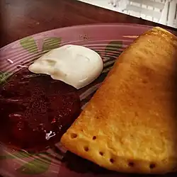 Svele (plural: sveler (indefinite), svelene (definite)), also known as lapp (plural: lapper), is a Norwegian batter-based cake. By size and texture they may bear some resemblance to American pancakes, but are usually eaten for afternoon coffee or as a snack between meals, served with butter and either sugar or brunost, folded in half to the shape of a crescent. Baking soda and salt of hartshorn are used as rising agent in svele, which give this cake its characteristic flavour. Recipes may differ slightly according to region or to house recipes, but usually include egg, sugar, kefir, wheat flour, and butter in addition to the above-mentioned rising agents.[1] The svele is fried on a griddle or in a lightly buttered frying pan.