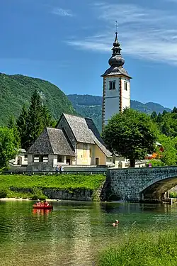 The church in Sveti Janez is dedicated to the John the Baptist and stands on the east shore of Lake Bohinj. The church was originally built in the Gothic style, and it has an open portico and a bell tower with a Baroque roof. The church is a single-naved structure with gilded altars, and it was painted with Gothic frescoes multiple times.[9]
