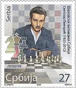 On September 23, 2020, the public company "Pošta Srbije" released a series of new postage stamps called: "Chess Giants of Serbia". In addition to Gligorić, Petar Trifunović, Boris Kostić, Milan Matulović and Milunka Lazarević were also given this honour. On that occasion, short biographies of the players depicted on these stamps were also published. The texts are given in Serbian and English, and their authors are: Gligorić's teammate from the national team and close friend, grandmaster Aleksandar Matanović and sports journalist Miroslav Nešić.[33]